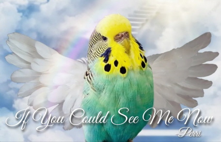 you to join me. I'm saving you a seat right next to me and Phoebe and Meeko and Houdini. And by the way, they all were there to greet me when I awoke at the Rainbow Bridge. I, for not one second, have felt lonely, though I do long for your snuggles and to hear your heart beat in my tiny ear. That day will come. For now, don't think of me as gone, but just as a few steps ahead of you. Thank you for all you have done for me. For every prayer, every sleepless night, every tear you cried thru watching me struggle, as it made me realize exactly how loved I am and it kept me fighting. I didn't want to leave you, but my body was tired. So I went to the bottom of my cage to take a rest, and Jesus came in and scooped me up and carried me home with Him. It's His turn to hold me now against his chest and listen to His heart beat. It's so beautiful! I wish you could hear it! Please know that I have seen every tear you have shed since I've left. I saw you when you found me resting on my cage bottom peacefully. I felt you when you held my lifeless body against your chest and gave me the scritches you promised you would give me in the morning. I saw my sister cry as she held me in her hands and caressed my face and stroked my back. I wanted to kiss away the tears, and I would have if I could have. Please don't cry for me, though. Please go on loving and caring for my brothers and the flock, and give Ommie extra snuggles, he needs them. He misses me so much. And please get some rest. You are tired. You stayed up with me for several weeks until the wee hours of the morning making sure I was fed enough to safely sleep. Now it is your turn to sleep. Take care of daddy. He needs you! Go places together as a family. You haven't left the house for almost a year because you were worried about me. Do not worry anymore. I'm being taken care of. I'm not sick anymore. And my pain is gone. You did all that you could out of love, and I will never forget a single sacrifice you made. I was deeply loved and I always will be. Let your heart rest knowing you did all that you could and I lived because of your love, and the love that held us high from all around the world. I am grateful for every single prayer, every sleepless night, every tasty morsel that filled my tummy, every doctor that tried to make me well, every dollar that came in so that I could receive the care I needed, and the ongoing love that you are still receiving from all around the world. We are loved, Mommy. Now just be held and know that some day soon we will be together again. I will be waiting at the Rainbow Bridge with wings open wide. - Perri "